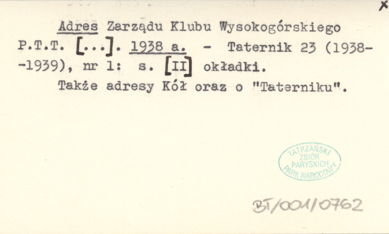 Adres Zarządu Klubu Wysokogórskiego P.T.T. [...]. 1938 a