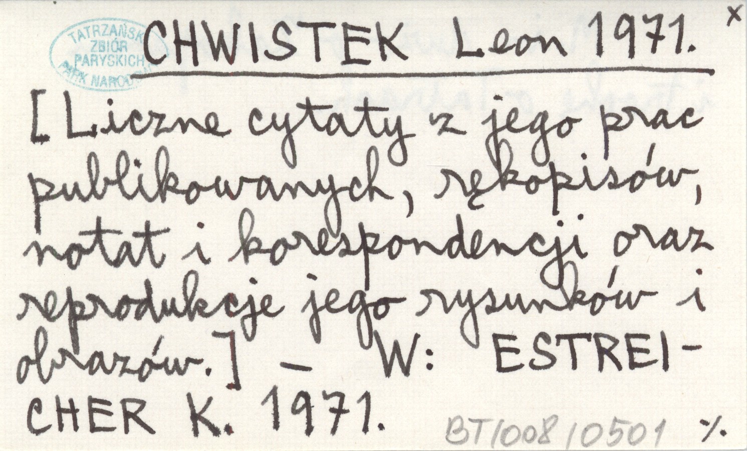 , [Liczne cytaty z jego prac publikowanych, rękopisów, notat i korespondencji oraz reprodukcje jego rysunków i obrazów]. M. in. dużo o Zakopanem i trochę o Tatrach. W: ESTREICHER K. 1971.