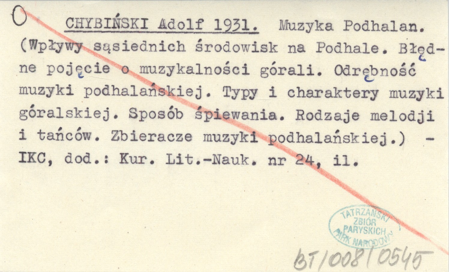 CHYBIŃSKI Adolf 1931 Muzyka Podhalan. (Wpływy sąsiednich środowisk na Podhale. Błędne pojęcie o muzykalności górali. Odrębność muzyki podhalańskiej. Typy i charaktery muzyki góralskiej. Sposób śpiewania. Rodzaje melodji i tańców. Zbieracze muzyki podhalańskiej).
