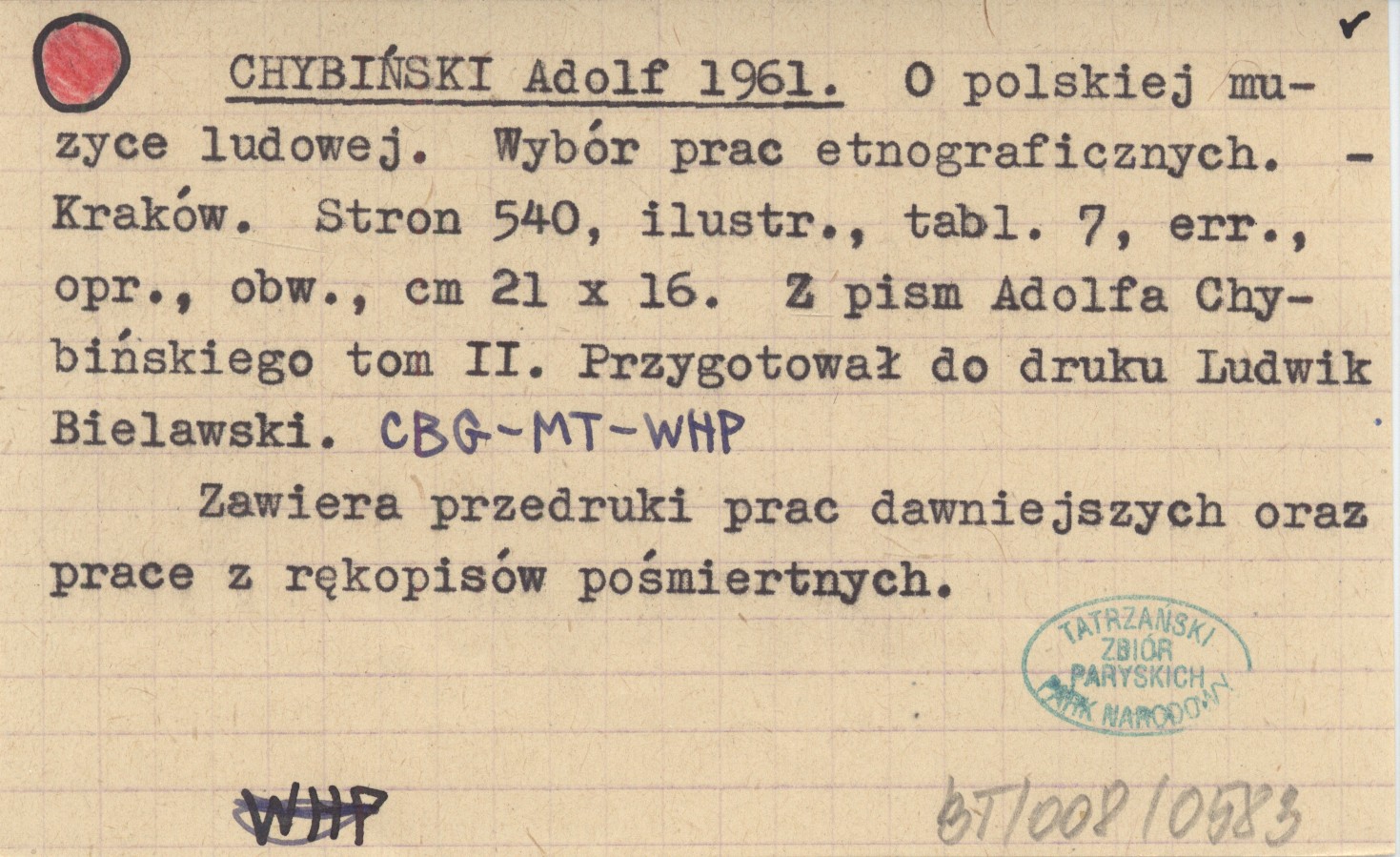 CHYBIŃSKI Adolf 1961 O polskiej muzyce ludowej. Wybór prac etnograficznych.