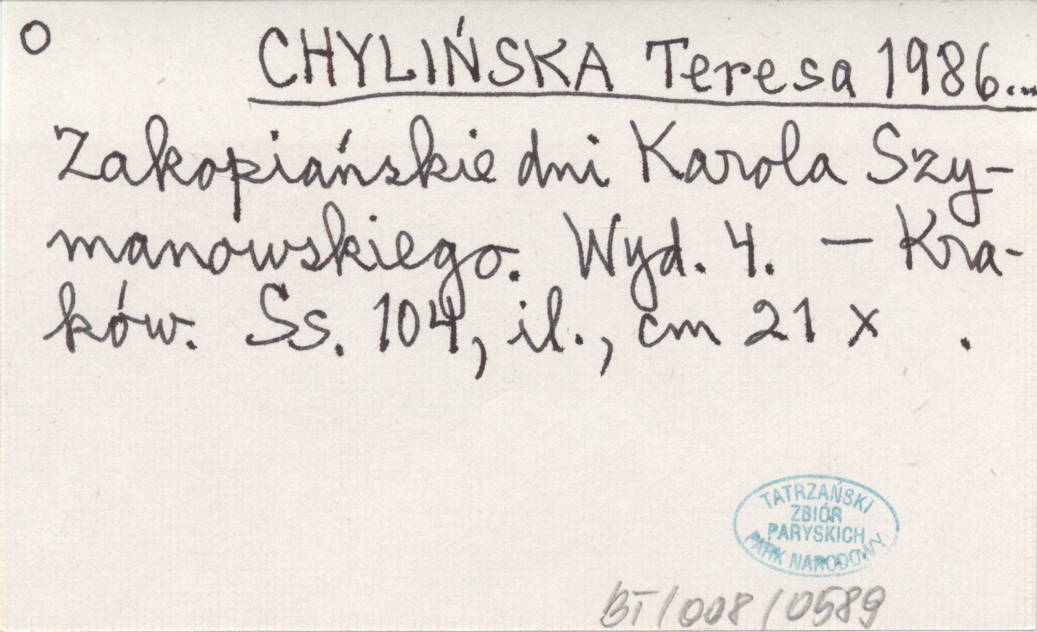 CHYLIŃSKA Teresa 1986... Zakopiańskie dni Karola Szymanowskiego.