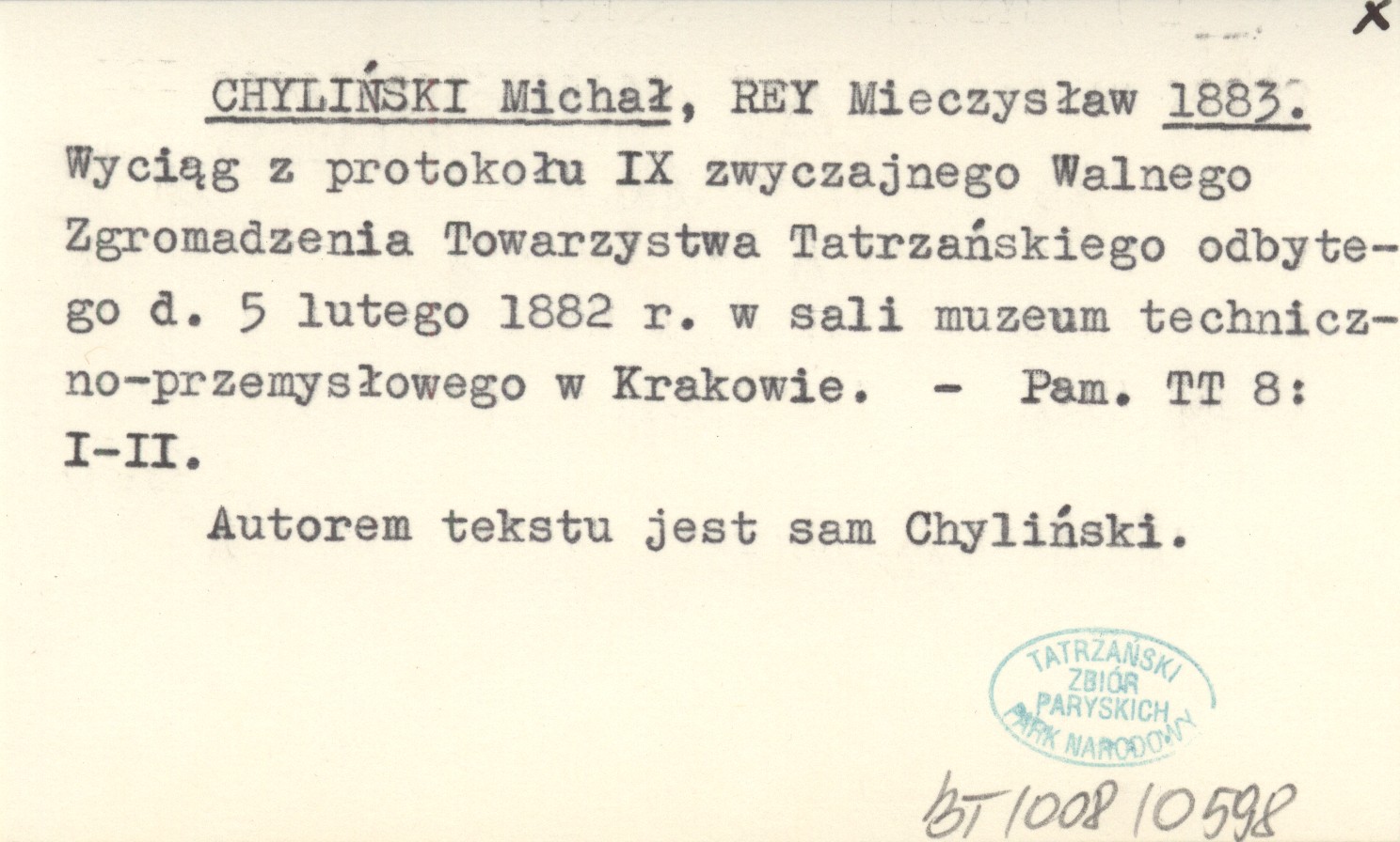 CHYLIŃSKI Michał REY, Mieczysław. ; 1883 Wyciąg z protokołu IX zwyczajnego Walnego Zgromadzenia Towarzystwa Tatrzańskiego odbytego d. 5 lutego 1882 r. w sali muzeum techniczno-przemysłowego w Krakowie.