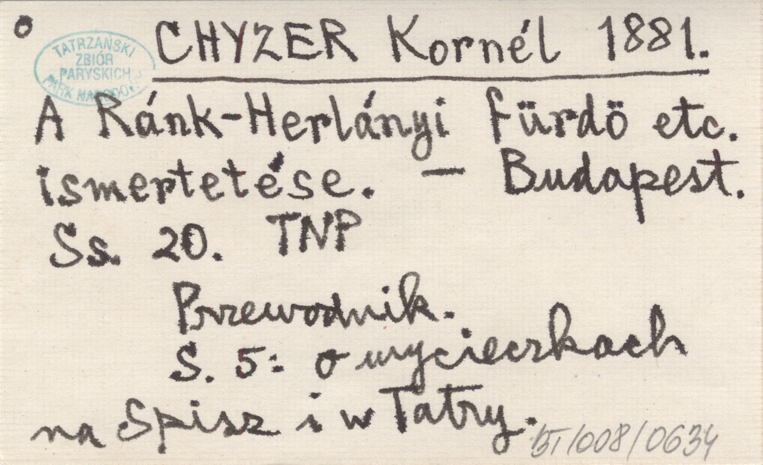 CHYZER Kornél 1881 A Ránk-Herlányi fürdö etc. ismertetese.