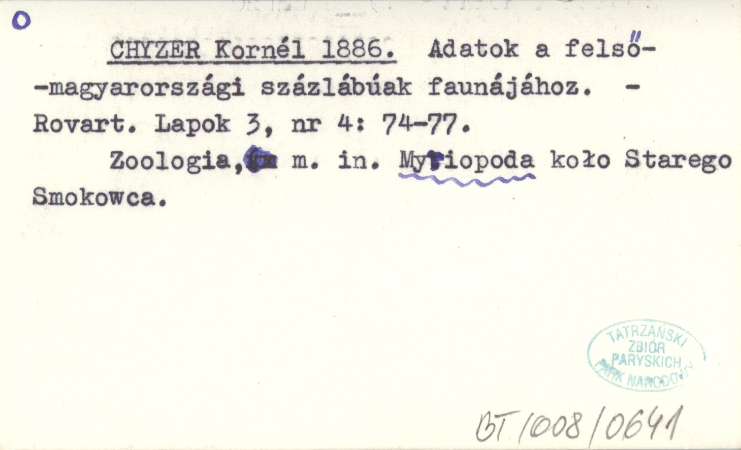 CHYZER Kornél 1886 Adatok a felső-magyarországi százlábúak faunájához.
