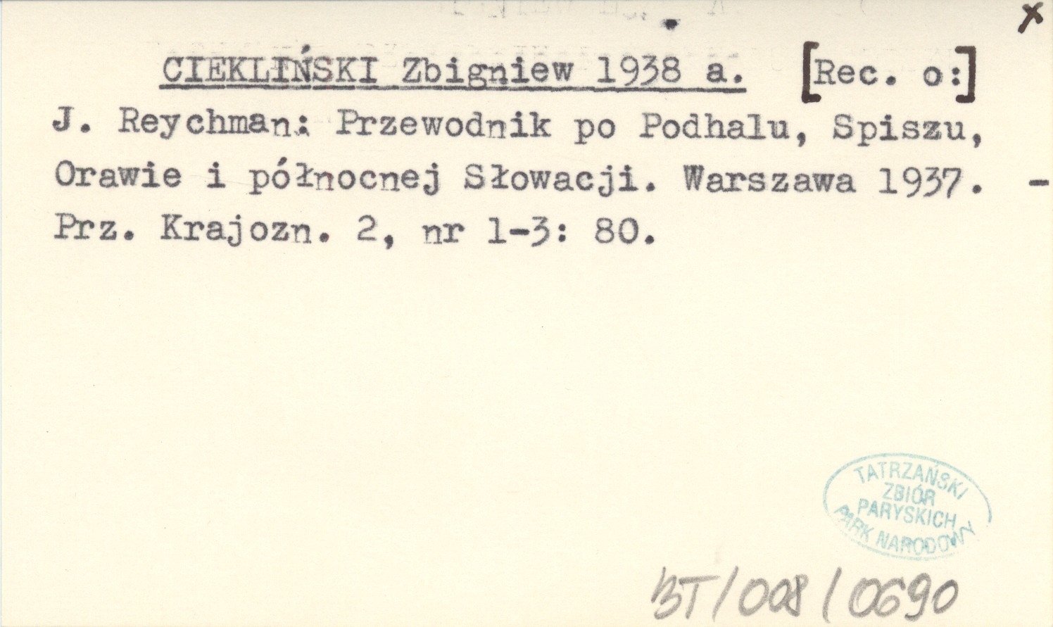 CIEKLIŃSKI Zbigniew 1938 a [Rec. o:] J. Reychman: Przewodnik po Podhalu, Spiszu, Orawie i północnej Słowacji. Warszawa 1937.