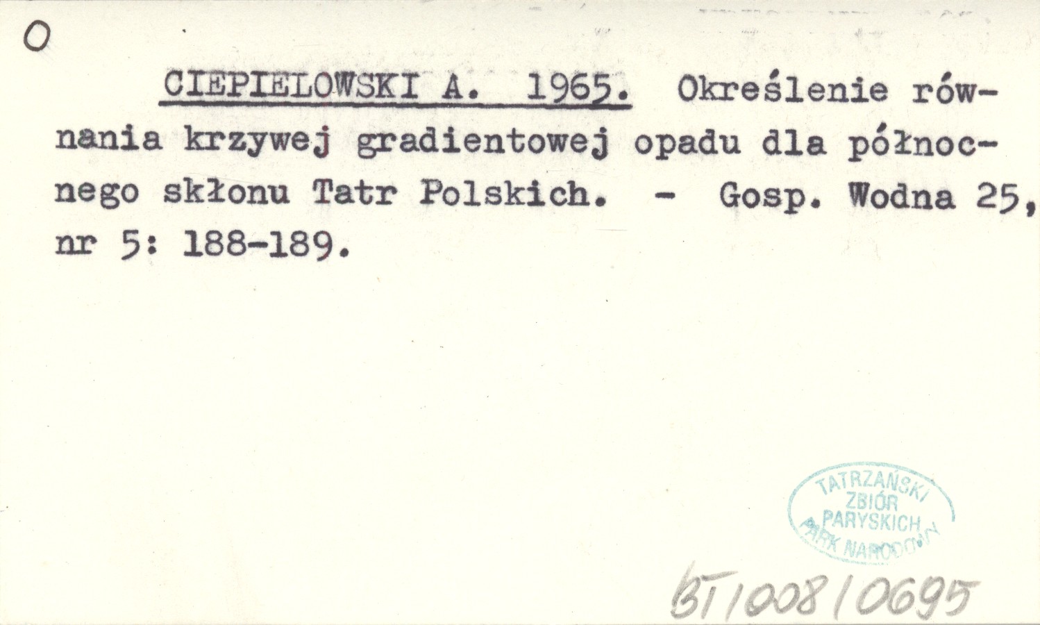 CIEPIELOWSKI A. 1965 Określenie równania krzywej gradientowej opadu dla północnego skłonu Tatr Polskich.