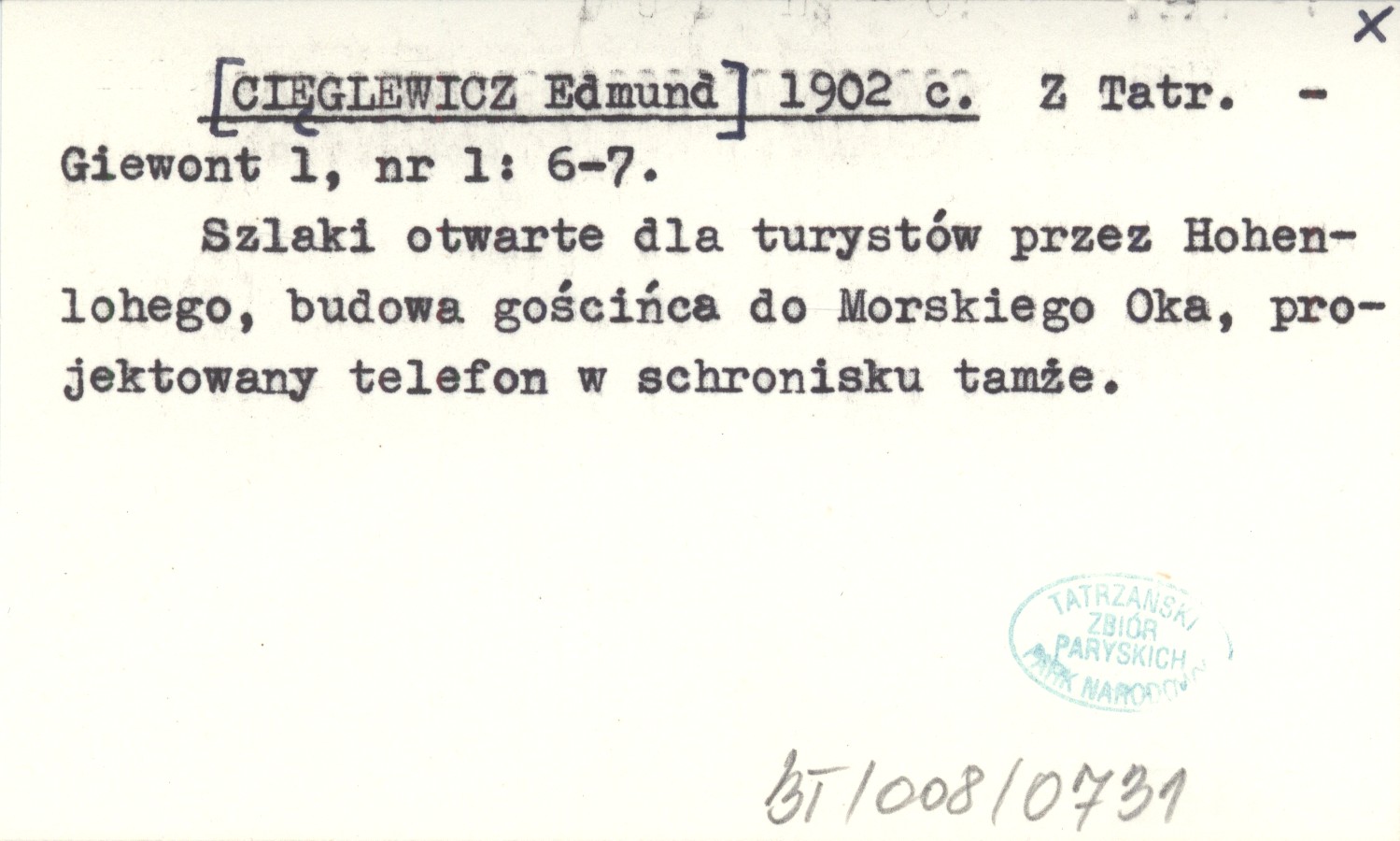 Giewont, 1, nr 1: 6-7. Szlaki otwarte dla turystów przez Hohenlohego, budowa gościńca do Morskiego Oka, projektowany telefon w schronisku tamże.