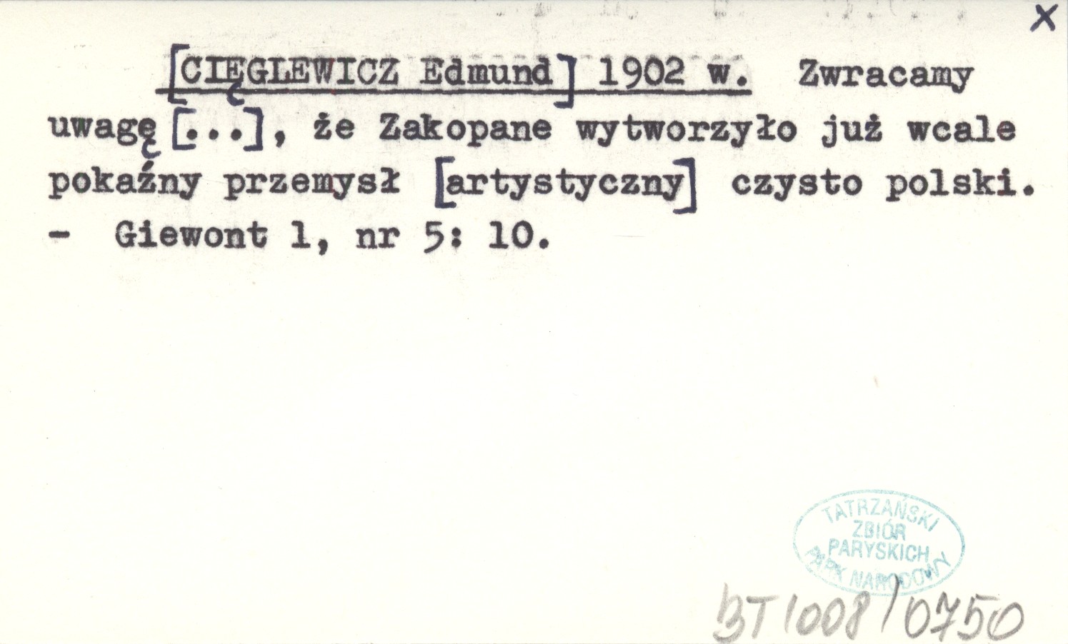 [CIĘGLEWICZ Edmund] 1902 w Zwracamy uwagę [...], że Zakopane wytworzyło już wcale pokaźny przemysł [artystyczny] czysto polski.