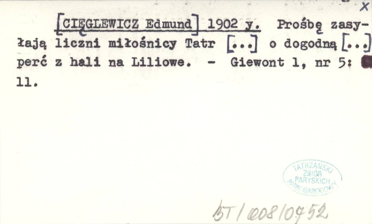 [CIĘGLEWICZ Edmund] 1902 y Prośbę zasyłają liczni miłośnicy Tatr [...] o dogodną [...] perć z hali na Liliowe.