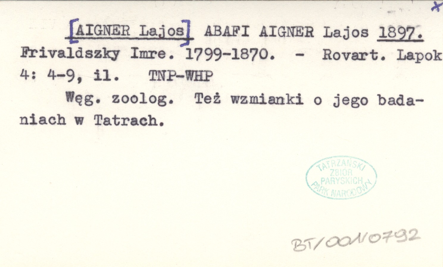 ABAFI AIGNER Lajos [AIGNER Lajos] 1897 Frivaldszky Imre. 1799-1870.