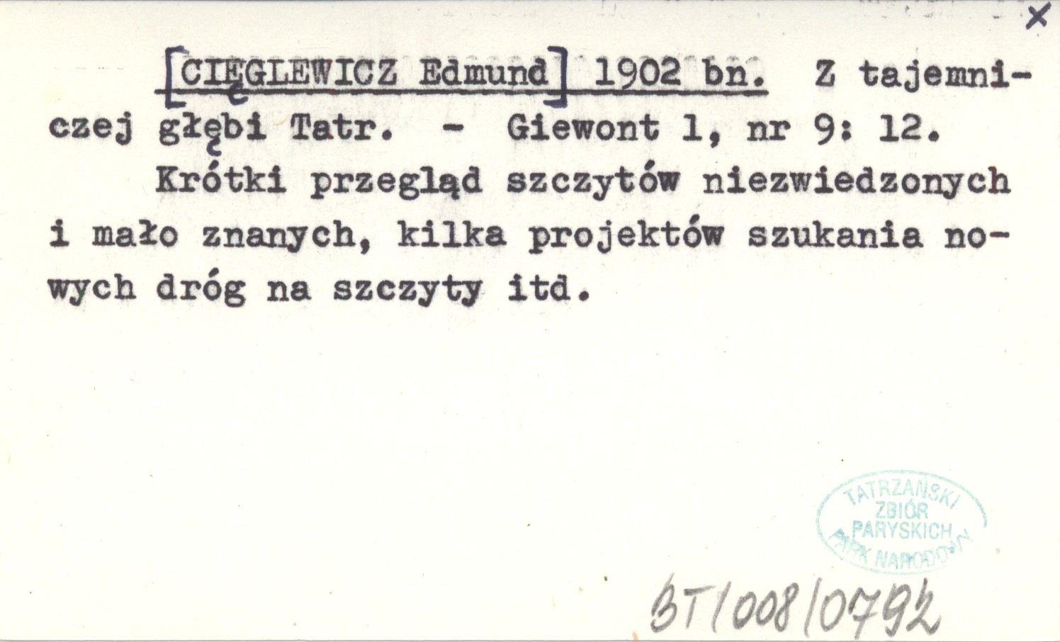 [CIĘGLEWICZ Edmund] 1902 bn Z tajemniczej głębi Tatr.