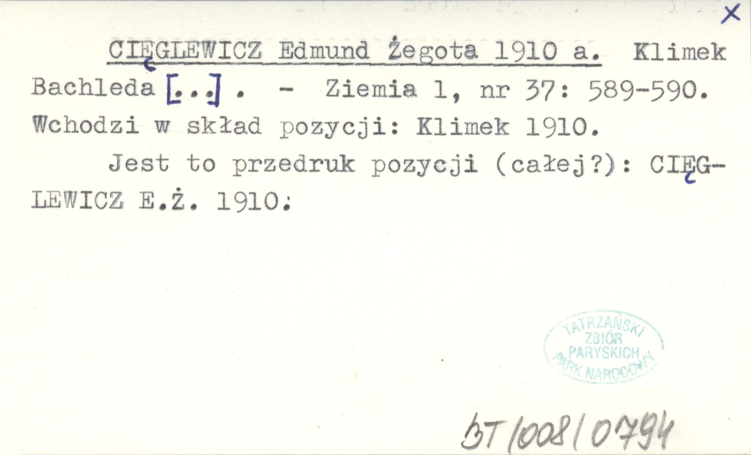 Ziemia, 1, nr 37: 589-590. Wchodzi w skład pozycji: Klimek 1910. Jest to przedruk pozycji (całej?): CIĘGLEWICZ E.Ż. 1910.