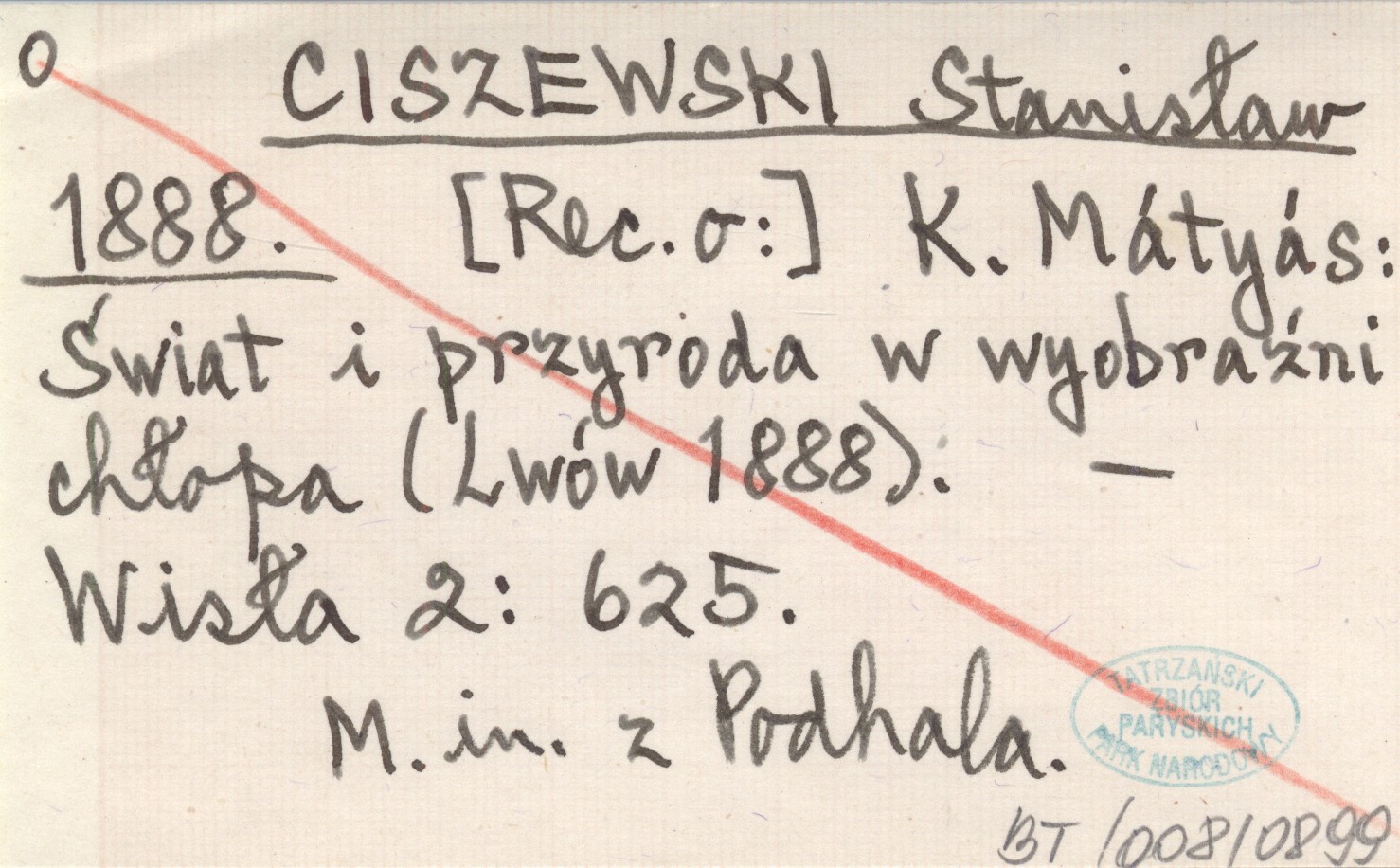 CISZEWSKI Stanisław 1888 [Rec. o:] K. Mátyás: Świat i przyroda w wyobraźni chłopa (Lwów 1888).