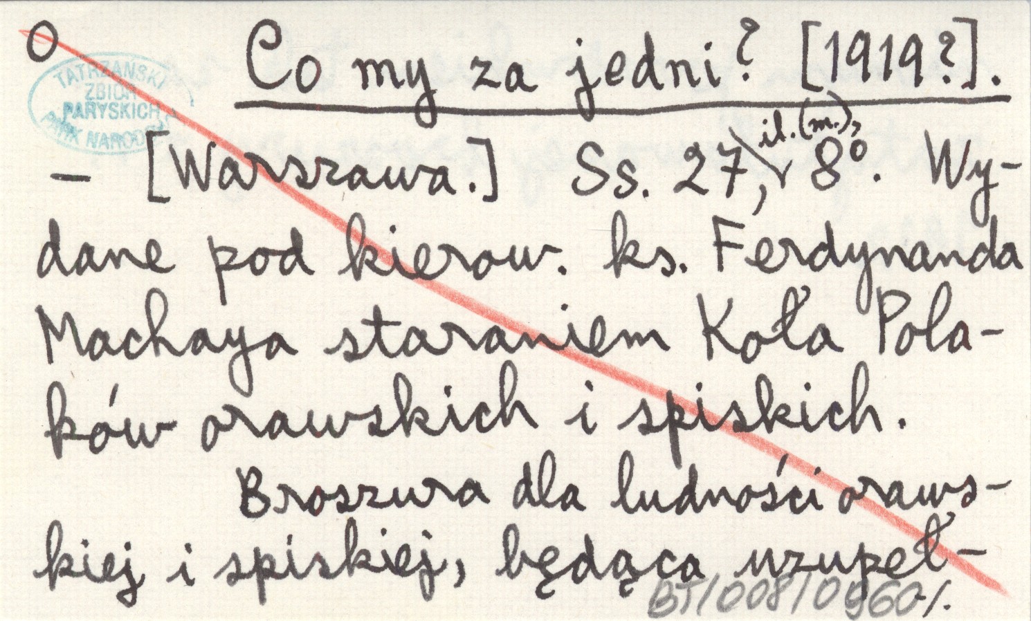 Warszawa , 27 s., il. (mapa), 8°. Broszura dla ludności orawskiej i spiskiej, będąca uzupełnionym przedrukiem tak samo zatytułowanej broszury z r. 1912. Wydane pod kierownictwem ks. Ferdynanda Machaya staraniem Koła Polaków orawskich i spiskich.