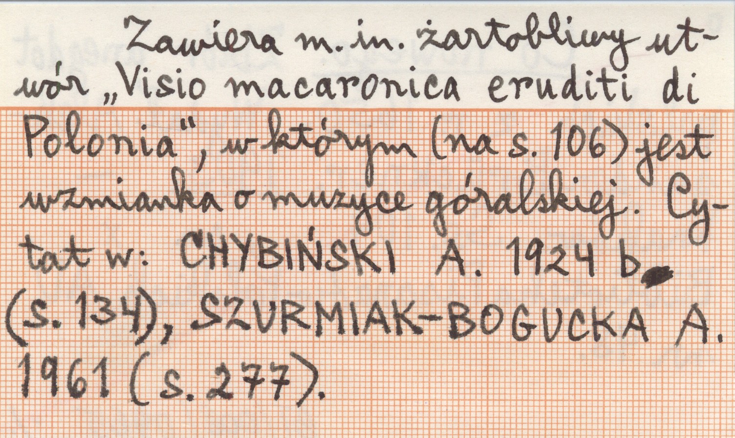 CHYBIŃSKI A. 1924 b (s. 134), SZURMIAK-BOGUCKA A. 161 (s. 277). Kraków (Biblioteka Pisarzów Polskich Akademii Umiejętności, nr 48) , 109 s. Zawiera m. in. żartobliwy utwór "Visio macaronica eruditi di Polonia", w którym (na s. 106) jest wzmianka o muzyce góralskiej.