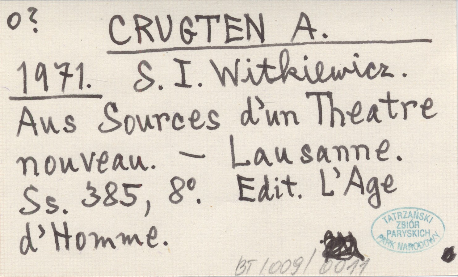 CRUGTEN A. 1971 S. I. Witkiewicz. Aus Sources d'un Theatre nouveau.