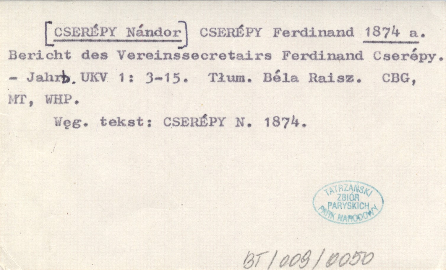 Jahrbuch des UKV, 1: 3-15. Tłum. Béla Raisz. Węgierski tekst: CSERÉPY N. 1874.