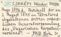 CSERÉPY Nándor PAYER, Hugo. ; 1876 d Protokoll der am 1. August 1875 in Tátrafüred abgehaltenen dritten ordentlichen Generalversammlung des "Ungarischen Karpathenvereines".