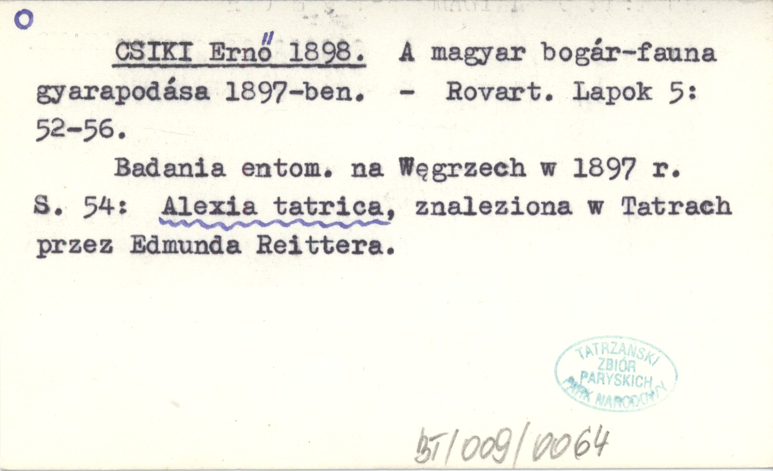 Rovart. Lapok, 5: 52-56. Badania entomologiczne na Węgrzech w 1897 r. S. 54: Alexia tatrica, znaleziona w Tatrach przez Edmunda Reittera.