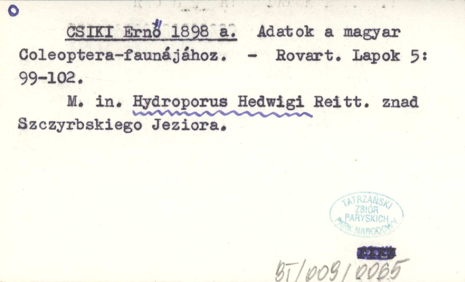 Rovart. Lapok, 5: 99-102. M. in. Hydroporus Hedwigi Reitt. znad Szczyrbskiego Jeziora.