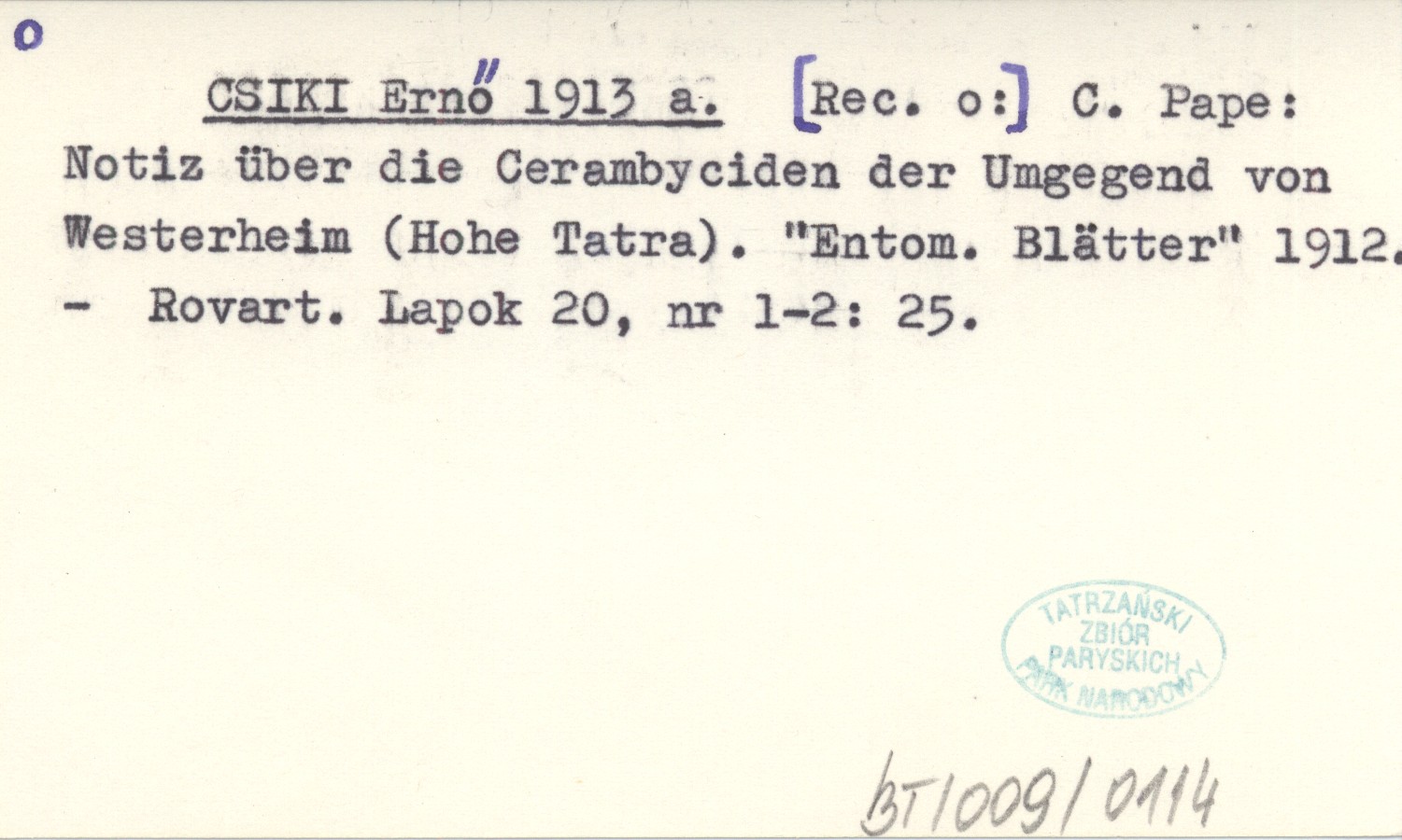 CSIKI Ernő 1913 a [Rec. o:] C. Pape: Notiz über die Cerambyciden der Umgegend von Westerheim (Hohe Tatra). "Entom. Blätter" 1912.