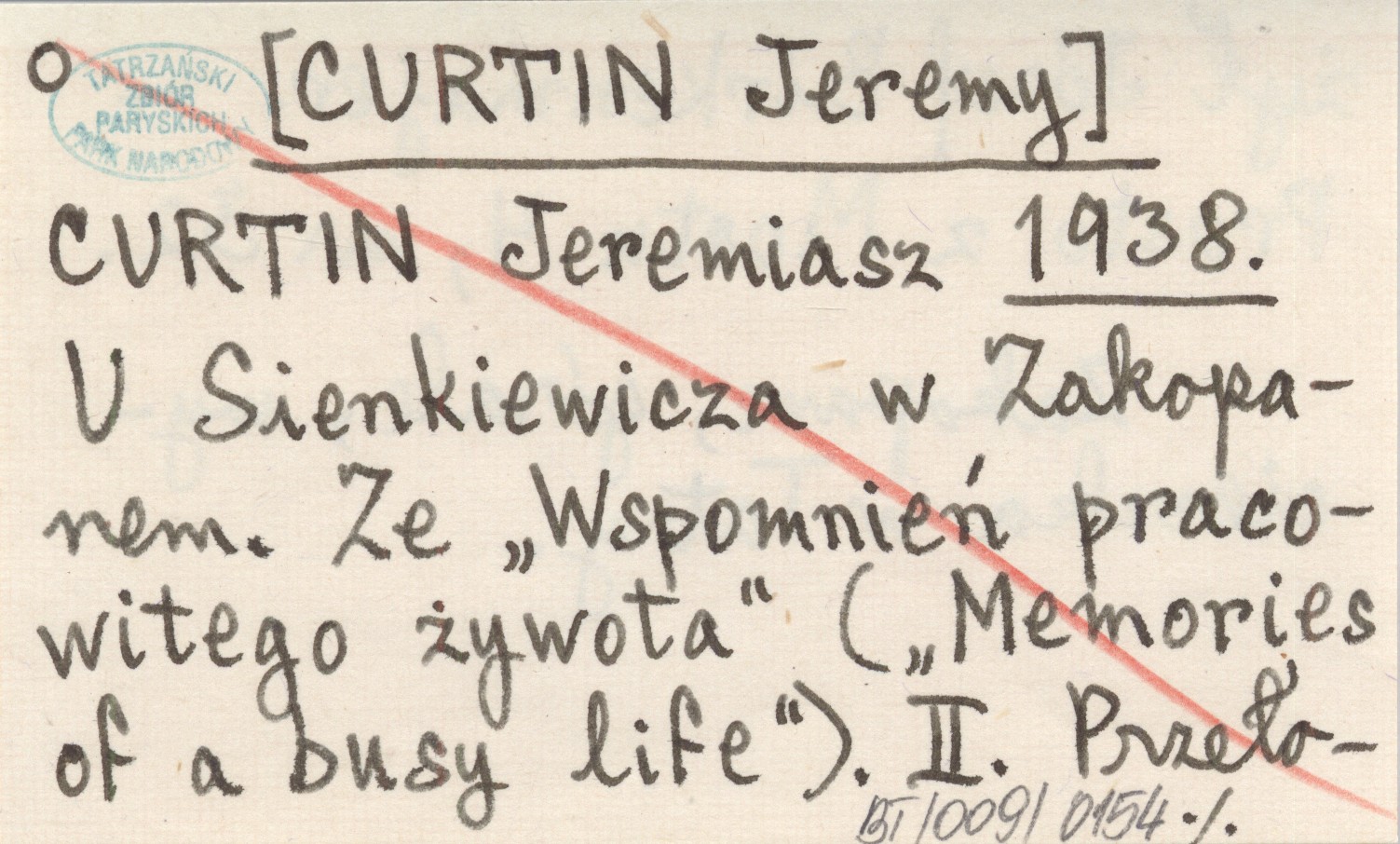 [CURTIN Jeremy] CURTIN Jeremiasz 1938 U Sienkiewicza w Zakopanem. Ze "Wspomnień pracowitego żywota" ("Memories of a busy life"). II. Przełożył Józef Birkenmajer.