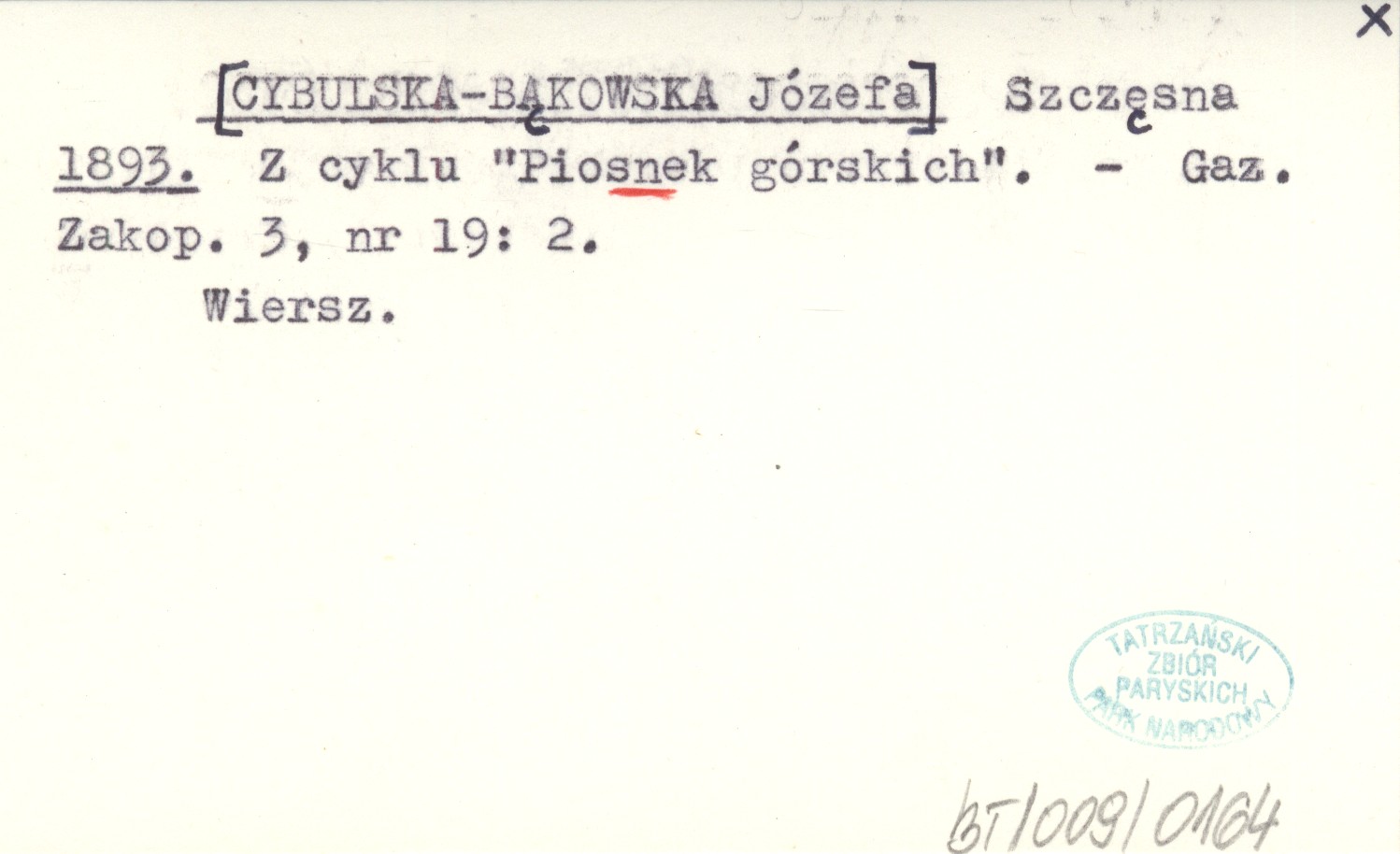 [CYBULSKA-BĄKOWSKA Józefa] SZCZĘSNA. ; 1893 Z cyklu "Piosnek górskich".