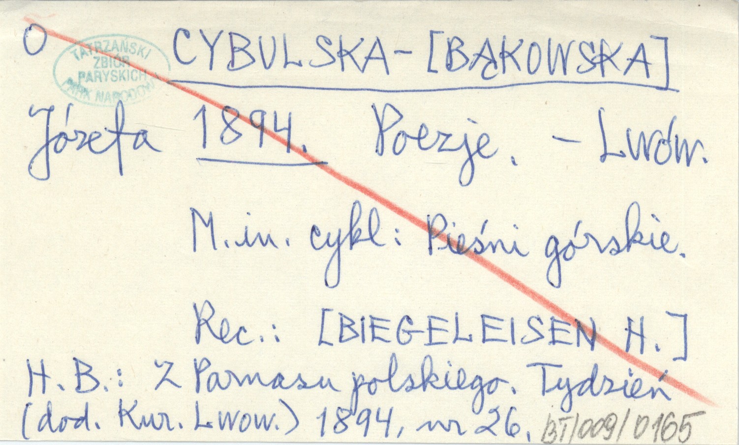 Lwów , M. in. cykl: Pieśni górskie. REC: [BIEGELEISEN H.] H. B.: Z Parnasu polskiego. Tydzień (dod. Kuriera Lwowskiego) 1894, nr 26.