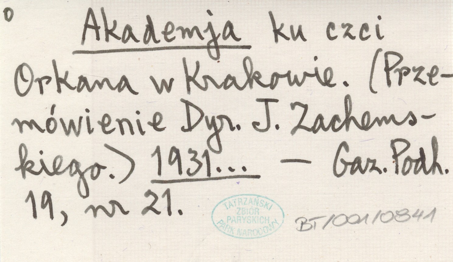 Akademja ku czci Orkana w Krakowie. (Przemówienie Dyr. J. Zachemskiego.) 1931...