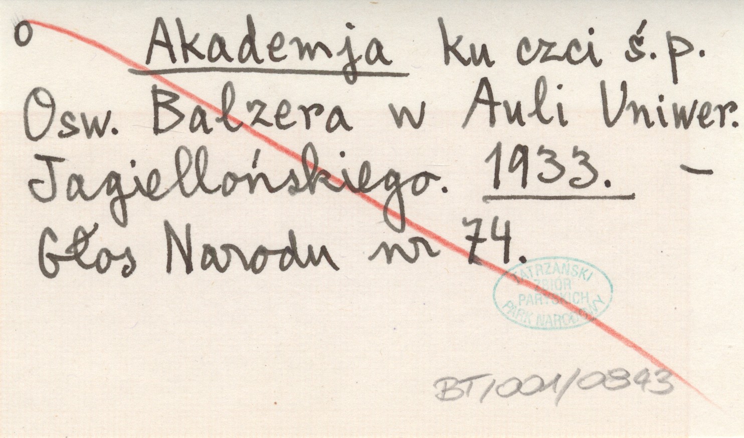 Akademja ku czci ś.p. Osw. Balzera w Auli Uniwer. Jagiellońskiego. 1933