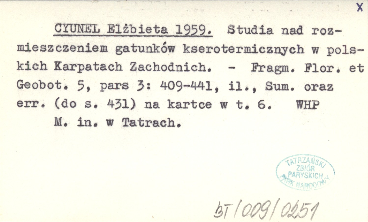 CYUNEL Elżbieta 1959 Studia nad rozmieszczeniem gatunków kserotermicznych w polskich Karpatach Zachodnich.