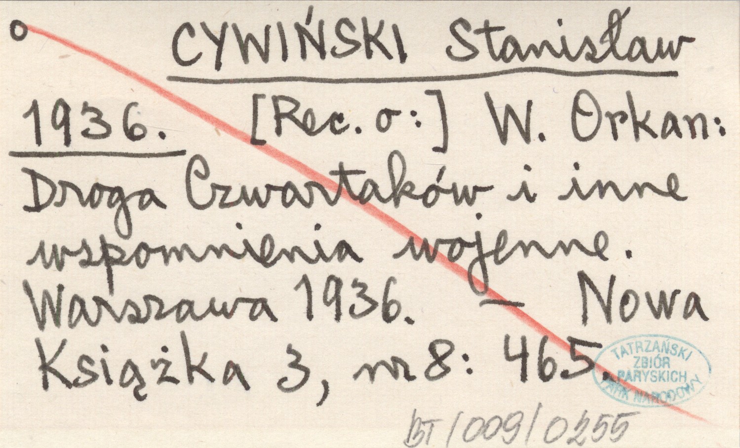 CYWIŃSKI Stanisław 1936 W. Orkan: Droga Czwartaków i inne wspomnienia wojenne. Warszawa 1936.