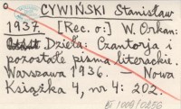 CYWIŃSKI Stanisław 1937 W. Orkan: Dzieła: Czantorja i pozostałe pisma literackie. Warszawa 1936.