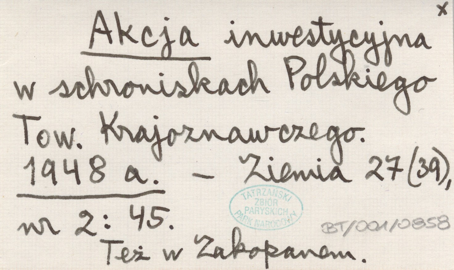 Akcja inwestycyjna w schroniskach Polskiego Tow. Krajoznawczego. 1948 a