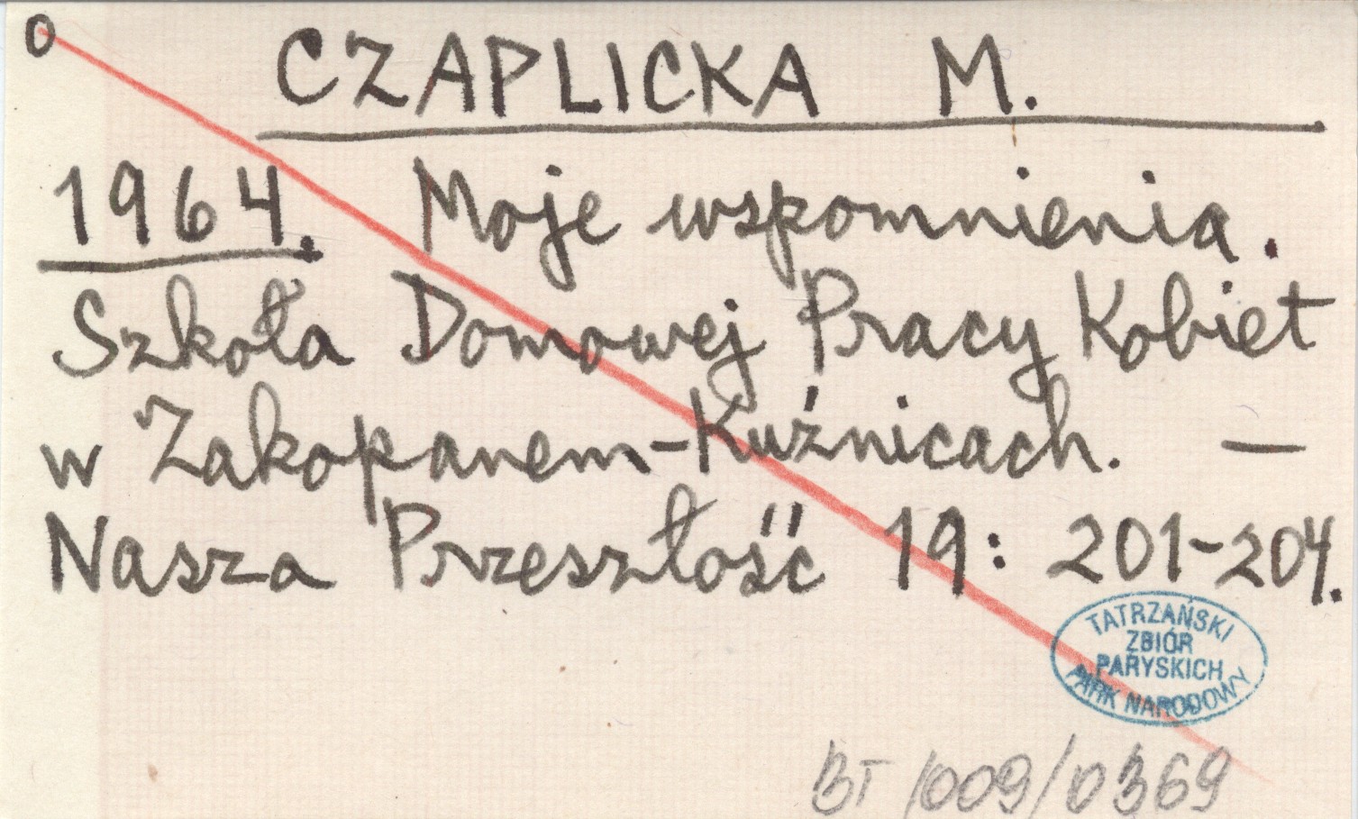 CZAPLICKA M. 1964 Moje wspomnienia. Szkoła Domowej Pracy Kobiet w Zakopanem-Kuźnicach.