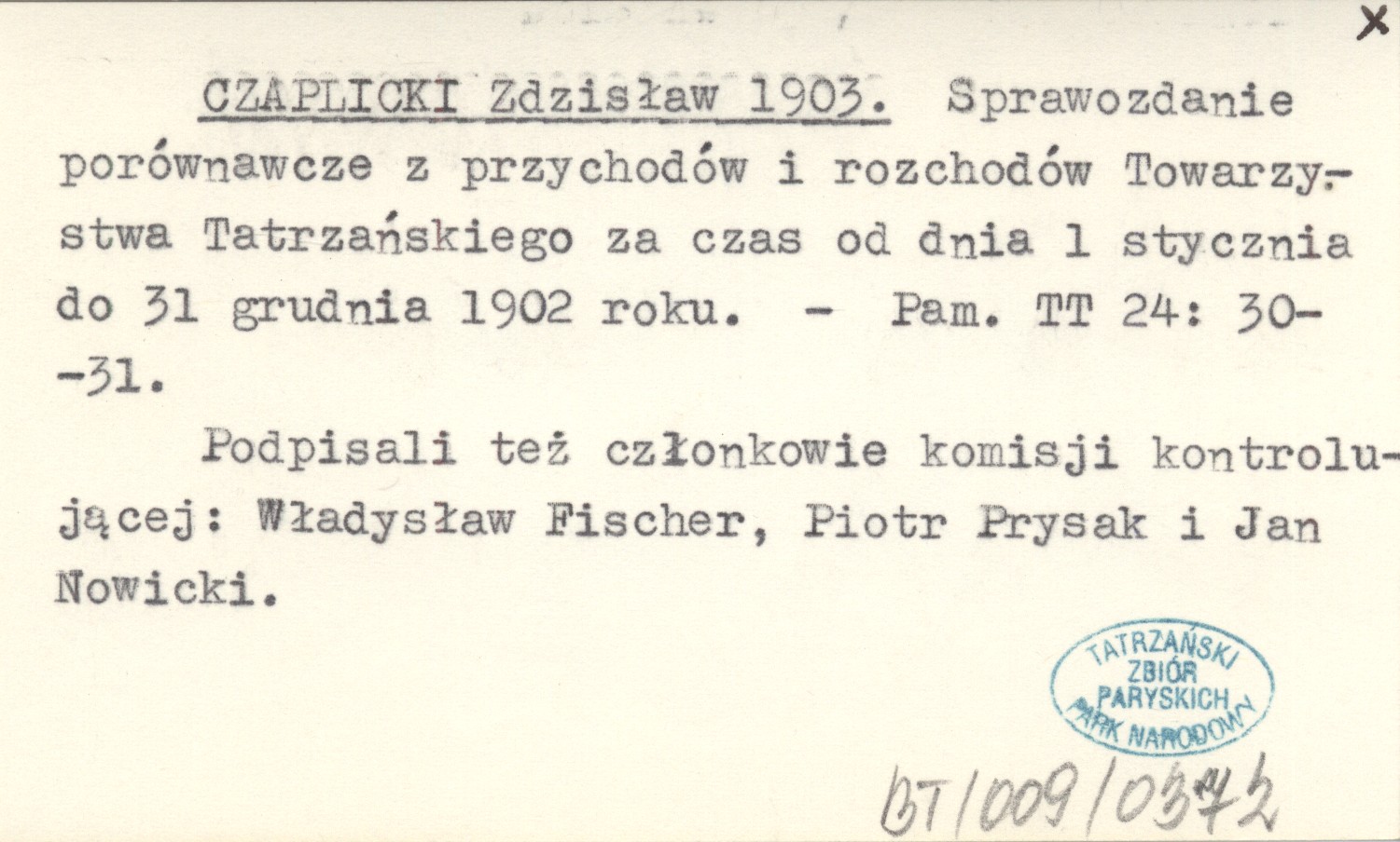 Pamiętnik Towarzystwa Tatrzańskiego., 24: 30-31. Podpisali też członkowie komisji kontrolującej: Władysław Fischer, Piotr Prysak i Jan Nowicki.