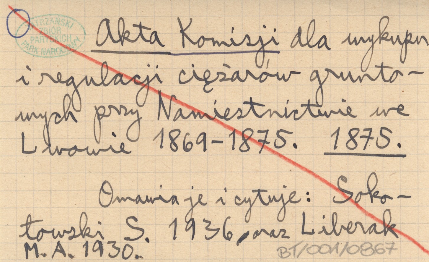 Akta Komisji dla wykupu i regulacji ciężarów gruntowych przy Namiestnictwie we Lwowie 1869-1875. 1875