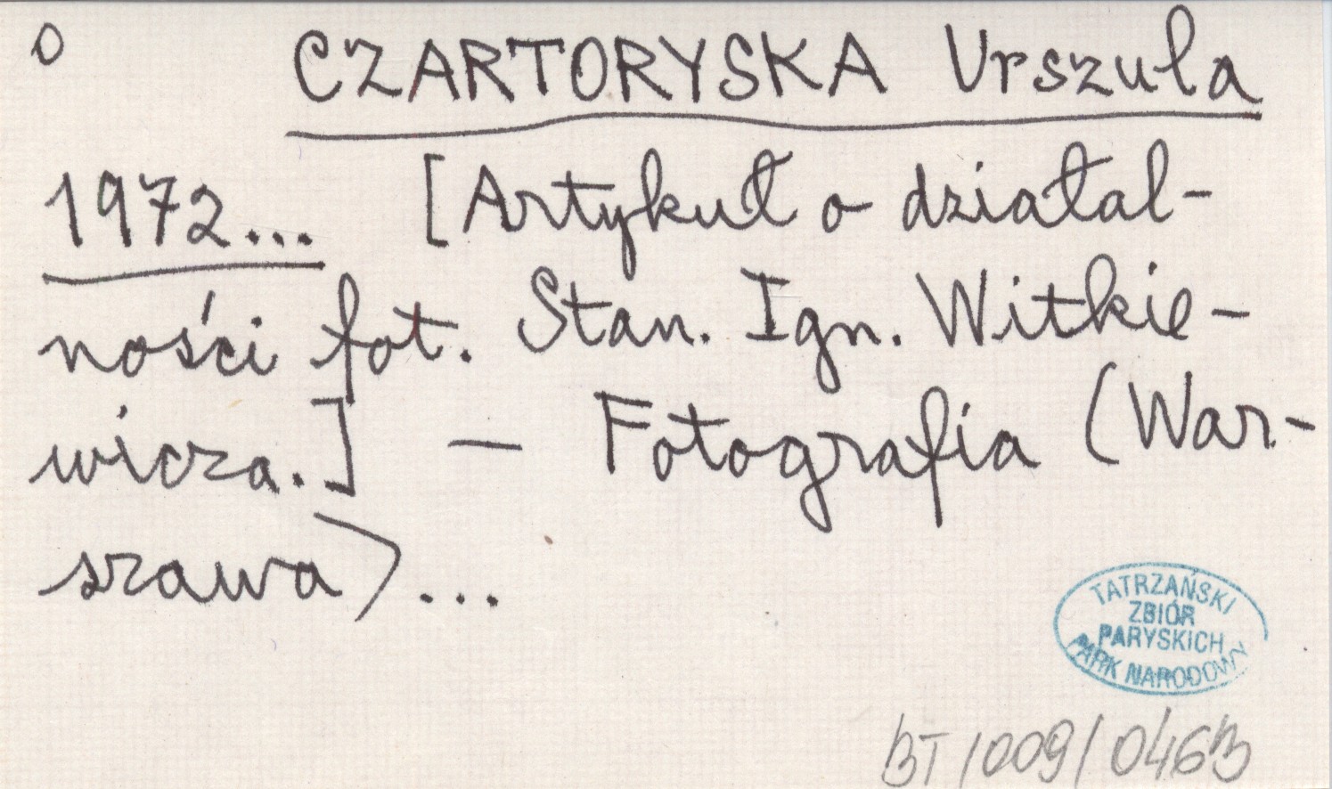 CZARTORYSKA Urszula 1972... [Artykuł o działalności fot. Stanisława Ignacego Witkiewicza].
