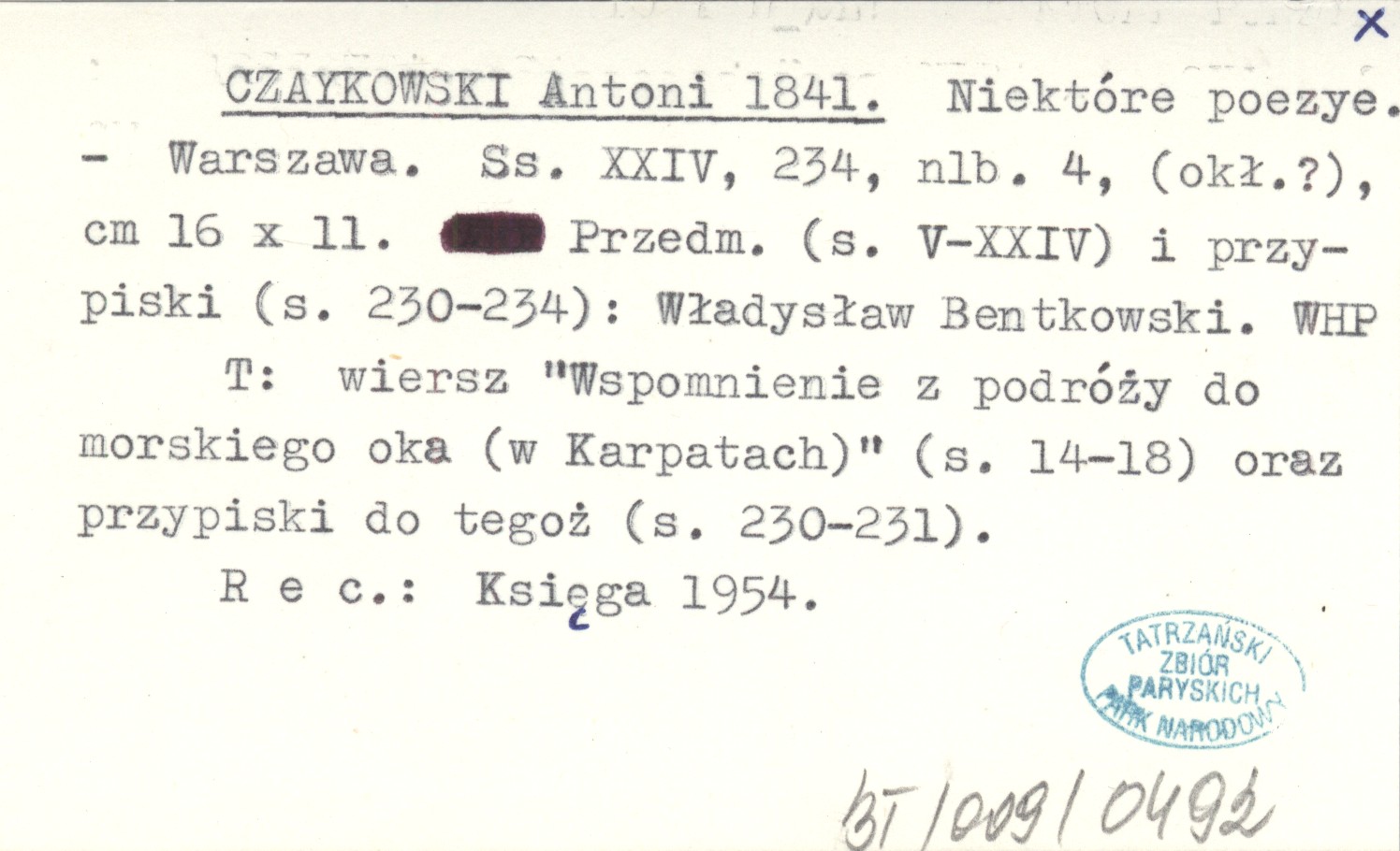 Warszawa , XXIV, 234, [4] s., (okł.?), 16x11 cm. Tatry: wiersz "Wspomnienie z podróży do morskiego oka (w Karpatach)" (s. 14-18) praz przypiski do tegoż (s. 230-231). Przedmowa (s. V-XXIV) i przypiski (s. 230-234): Władysław Bentkowski. REC: Księga 1954.