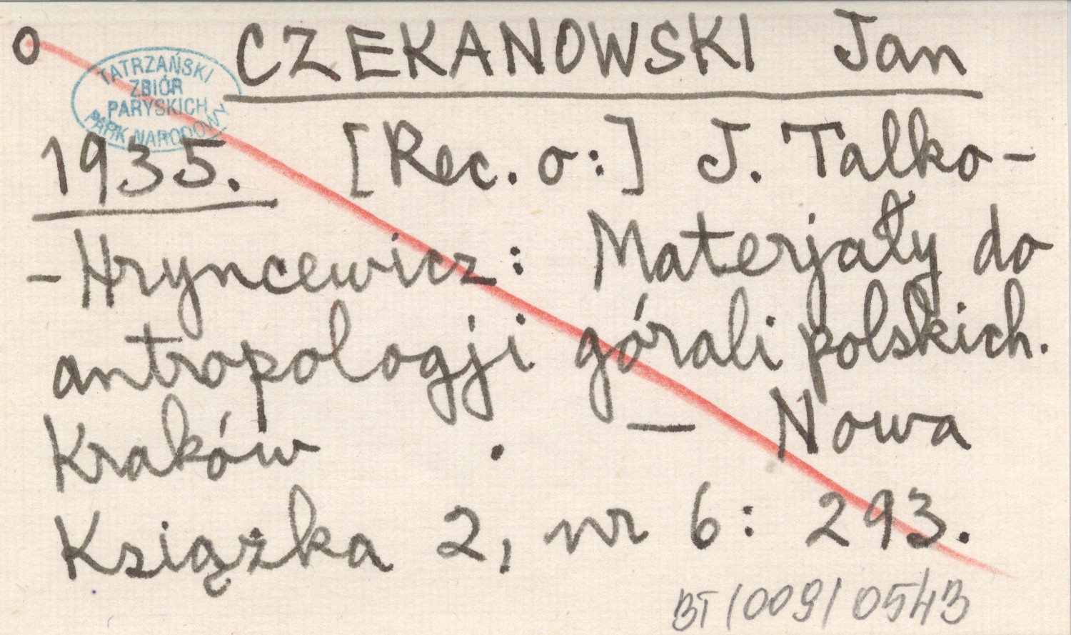 CZEKANOWSKI Jan 1935 J. Talko-Hryncewicz: Materjały do antropologji górali polskich. Kraków.