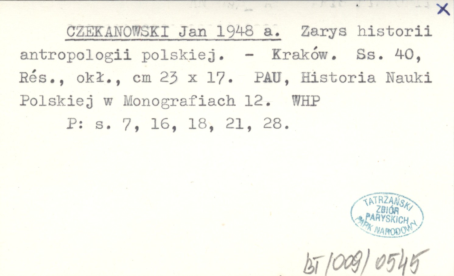 CZEKANOWSKI Jan 1948 a Zarys historii antropologii polskiej.