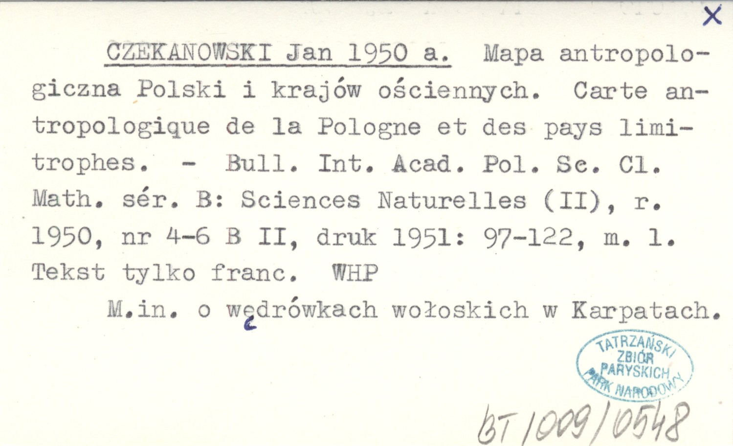 CZEKANOWSKI Jan 1950 a Mapa antropologiczna Polski i krajów ościennych. Carte antropologique de la Pologne et des pays limitrophes. Sér. B: Sciences Naturelles (II)