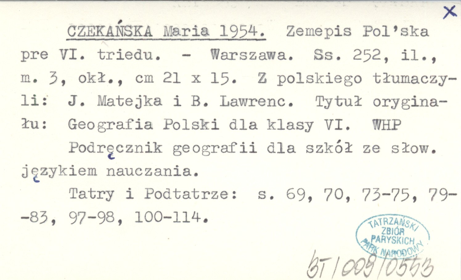 Warszawa , 252 s., il., 3 mapy, okł., 21x15 cm. Podręcznik geografii dla szkół ze słow. językiem nauczania. Tatry i Podtatrze: s. 69, 70, 73-75, 79-83, 97-98, 100-114. Z polskiego tłumaczyli: J. Matejka i B. Lawrenc. Tytuł oryginału: Geografia Polski dla klasy VI.