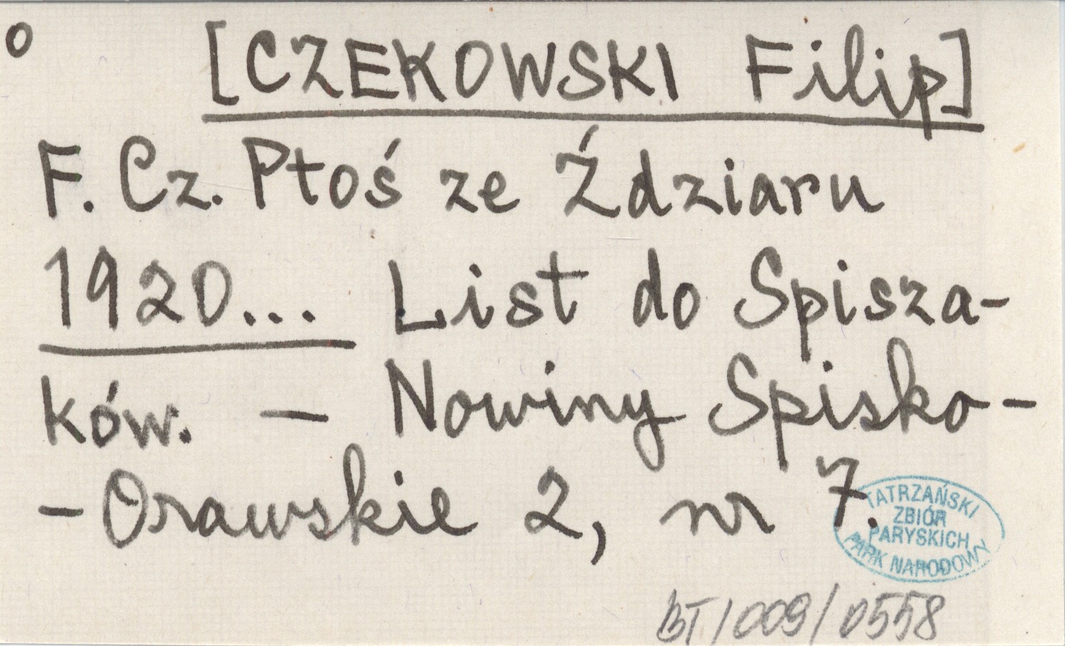 F. Cz. Ptoś ze Ździaru [CZEKOWSKI Filip] 1920... List do Spiszaków.
