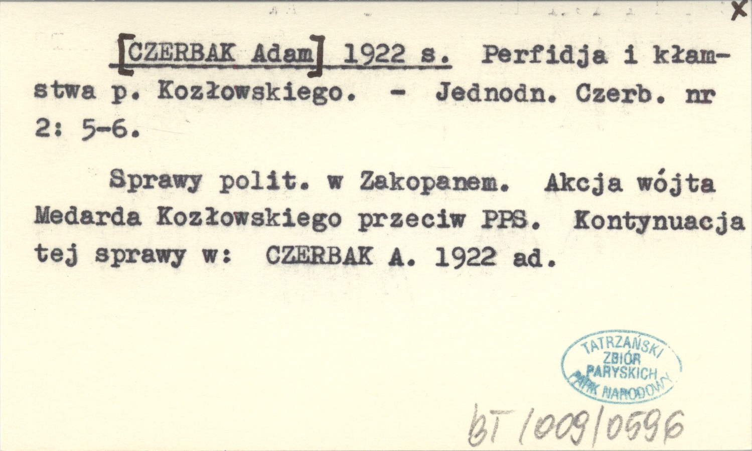 Jednodniówka Czerbaka, Nr 2: 5-6. Sprawy polityczne w Zakopanem. Akcja wójta Medarda Kozłowskiego przeciw PPS. Kontynuacja tej sprawy w: CZERBAK A. 1922 ad.