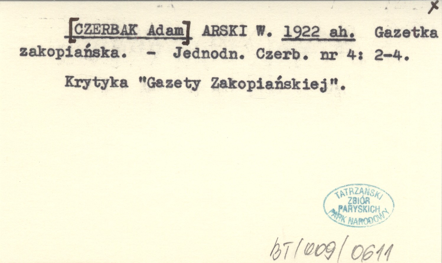 [CZERBAK Adam] ARSKI, W. ; 1922 ah Gazetka zakopiańska.