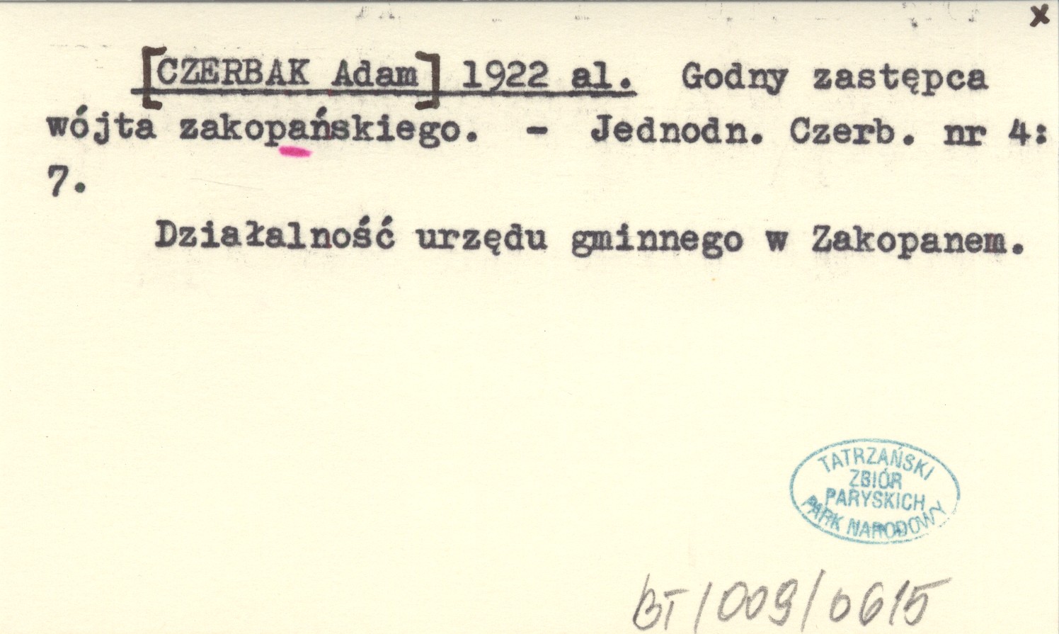 [CZERBAK Adam] 1922 al Godny zastępca wójta zakopańskiego.