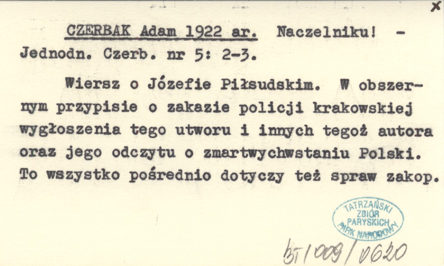 Jednodniówka Czerbaka, Nr 5: 2-3. Wiersz o Józefie Piłsudskim. W obszernym przypisie o zakazie policji krakowskiej wygłoszenia tego utworu i innych tegoż autora oraz jego odczyt o zmartwychwstaniu Polski. To wszystko pośrednio dotyczy też spraw zakopiańskich.