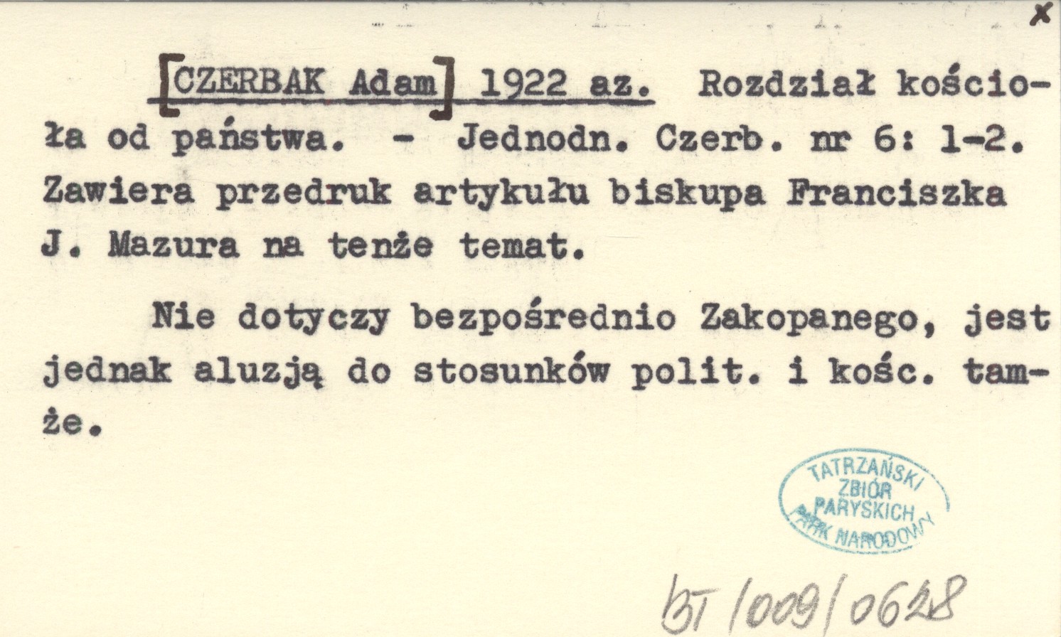 [CZERBAK Adam] 1922 az Rozdział kościoła od państwa.