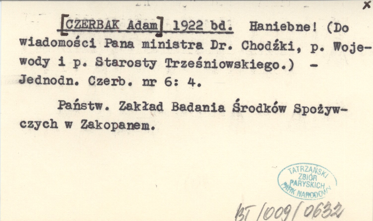 [CZERBAK Adam] 1922 bd Haniebne! (Do wiadomości Pana ministra Dr. Chodźki, p. Wojewody i p. Starosty Trześniowskiego).